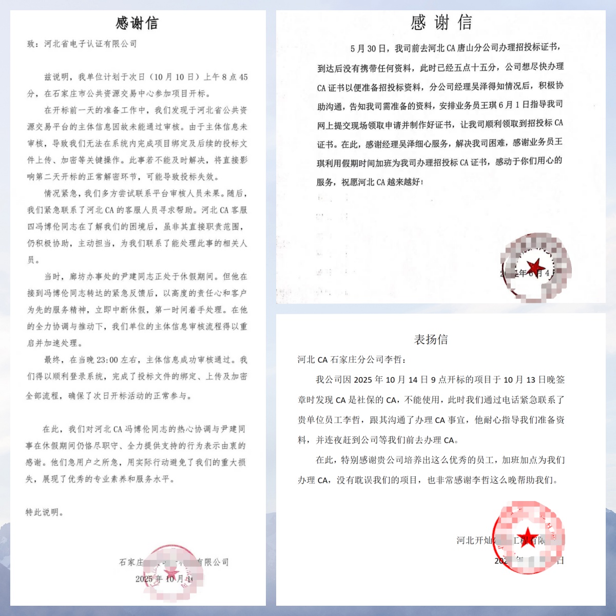 除了政務、醫療領域,來自企業和個人用戶的認可也從未間斷。我司眾多服務人員始終把客戶需求放在首位,甘愿犧牲個人休息時間,即便到了深夜十點多,仍會為有緊急需求的用戶答疑解惑、加急辦理業務,周末假期也常能看到大家到崗辦公的身影,竭盡所能為用戶解決認證難題。證書管理部李哲連夜趕到公司等候客戶辦理 CA、唐山分公司王琪、呼叫中心馮博倫、廊坊分公司尹健利用假期加班指導申請并制作招投標證書,正是這份堅守的生動縮影。有小微企業主在表揚信中寫道:“河北CA的服務太貼心了,從證書辦理到后續維護,全程指導,通俗易懂,解決了我們不懂技術的難題”;有個人用戶特意送來錦旗,感謝我們的服務人員耐心解答疑問,高效辦理業務,省去了來回奔波的麻煩。